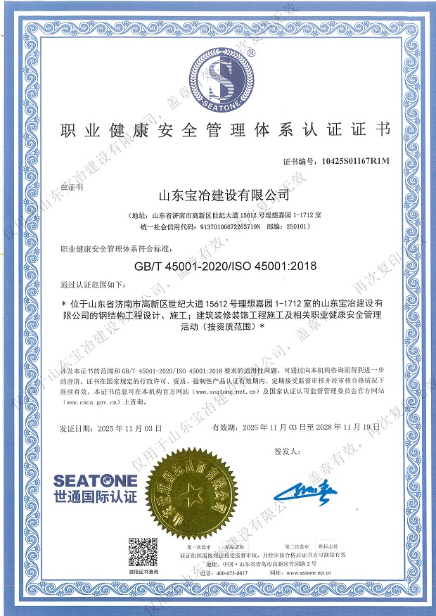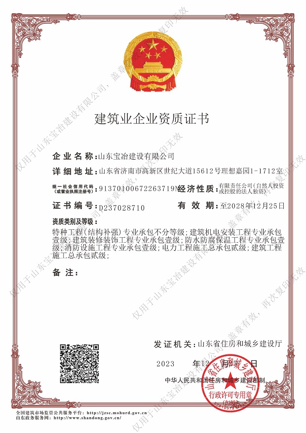 山東寶冶建設有限公司地處山東省濟南市高新技術開發區。經過多年的發展,現已具備建筑施工總承包、電力工程施工總承包、承裝(修、試)電力設施專業承包、鋼結構工程專業承包、特種工程(結構補強)專業承包、建筑裝修裝飾工程專業承包、建筑機電安裝工程專業承包、建筑幕墻工程專業承包、消防設施工程專業承包、防水防腐保溫工程專業承包、輕型鋼結構工程設計專項資質,可承接上述資質承攬范圍內的工程設計與施工。